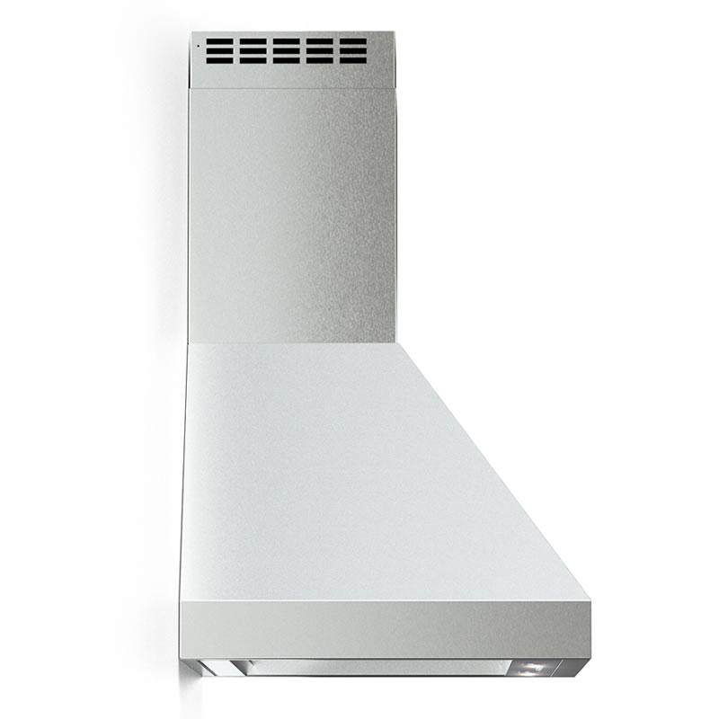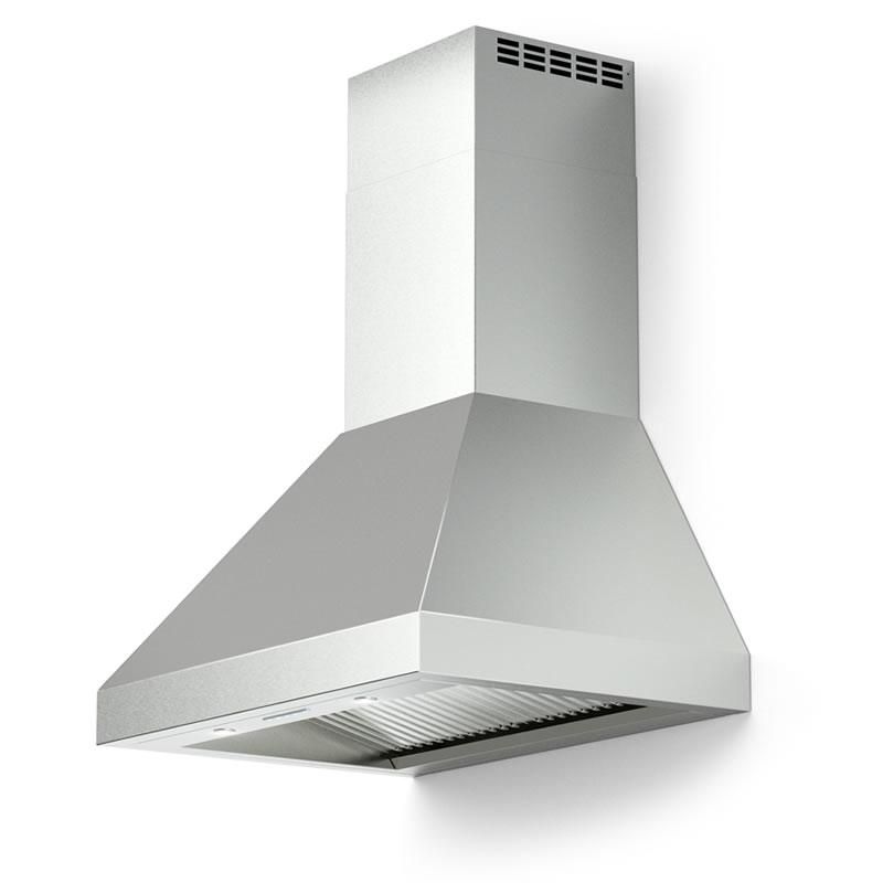 Verona’s 30" Designer Series wall mounted chimney hood features 4 fan speeds, time delay shut-off, stainless steel baffle filters, and 2 LED lights.